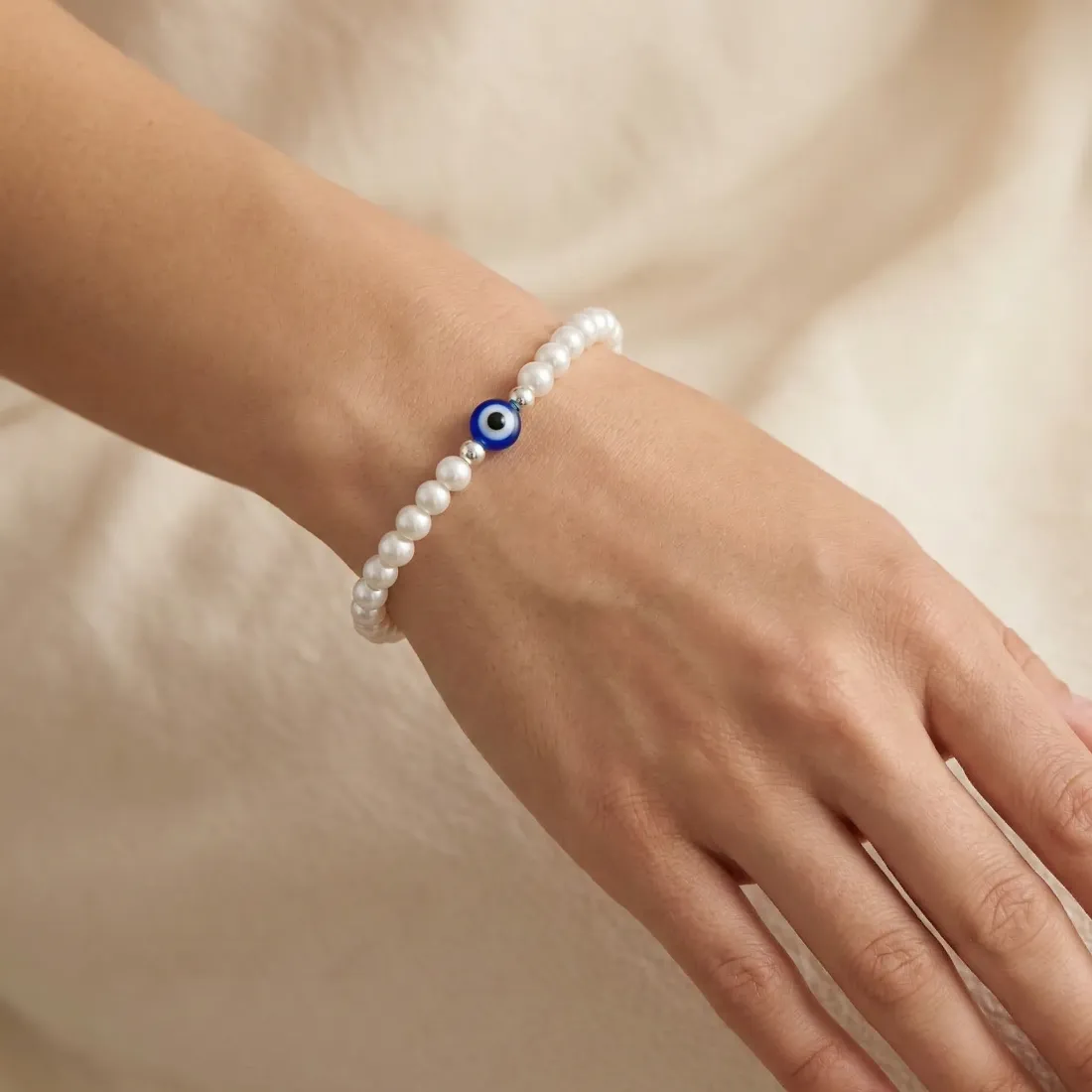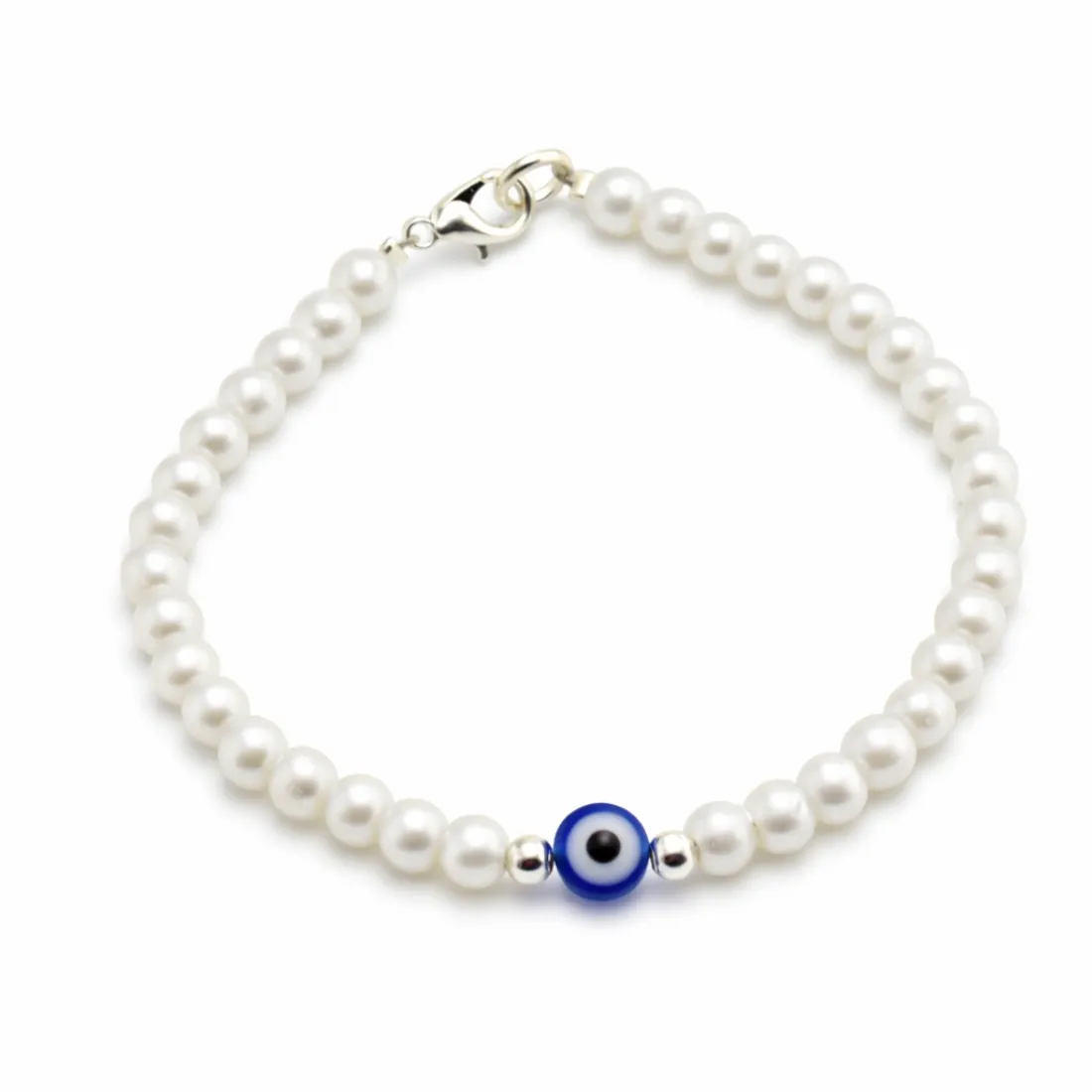 pulsera perlas c/ ojo turco 17cm acero blanco