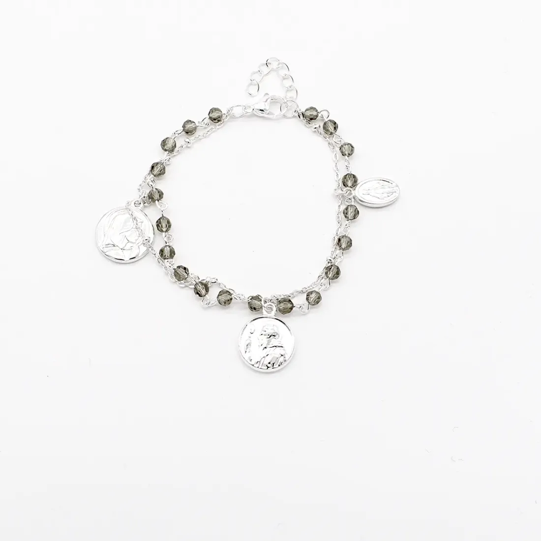 2X1 20cm Pulsera acero blanco bolitas y cristales con dijes religosos